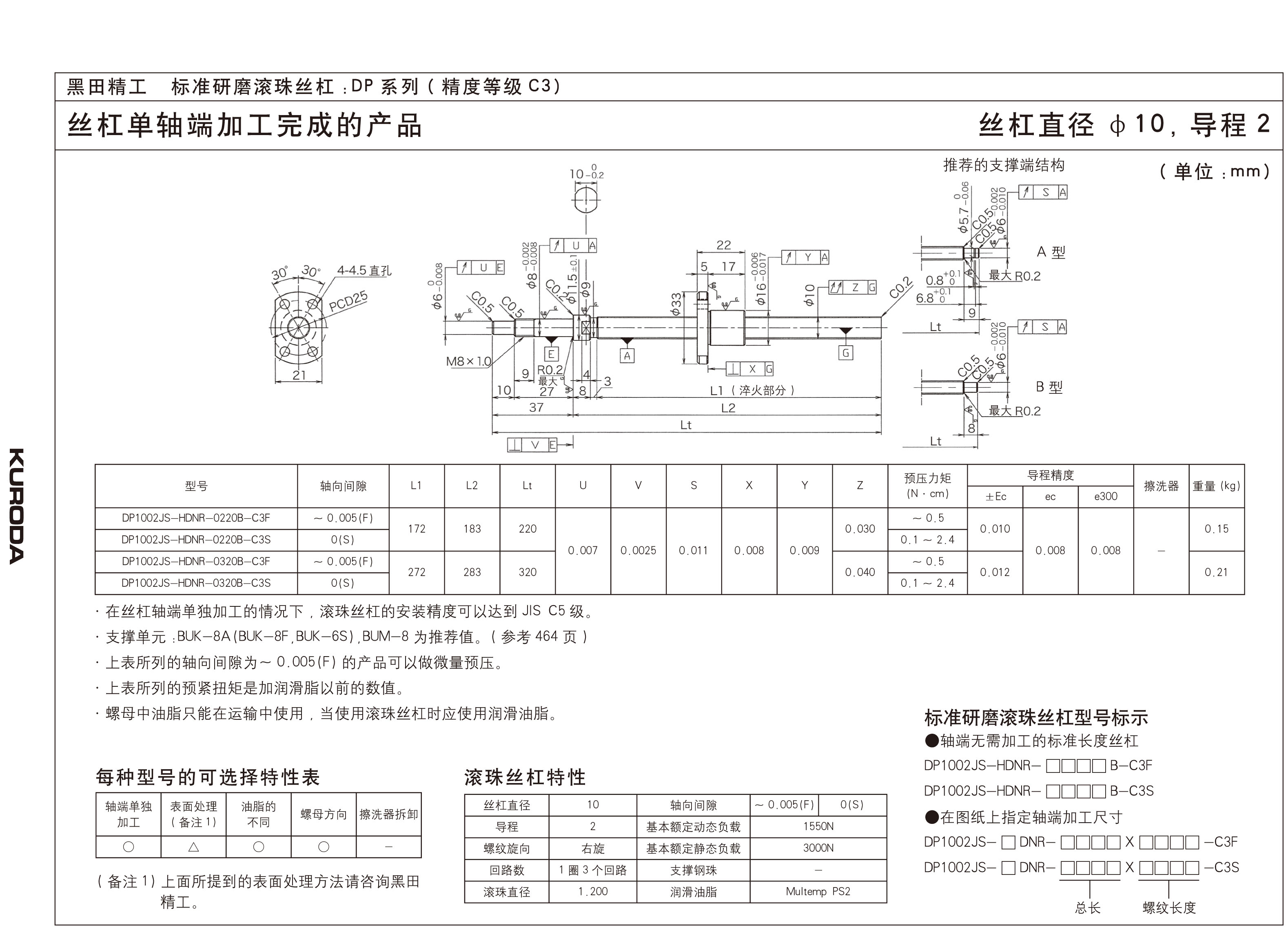 在JIS C3等級中,軸向間隙為S(預壓型號)軸向間隙為F(小于0.005)的型號系列可以實現高精度進給